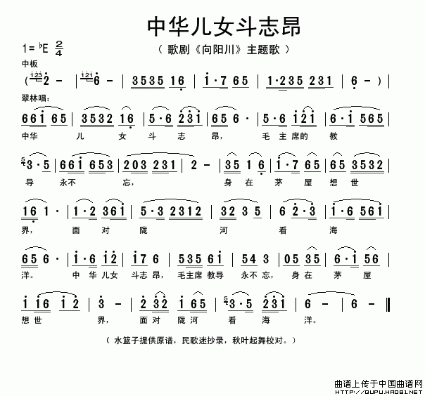 《向阳川》是敬爱的周总理观看和赞扬过的一部歌剧。主题歌《中华儿女斗志昂》收录在《名人民歌大联唱》中。请看:http://bbs.itjmz.com/read.php?tid=101633 。