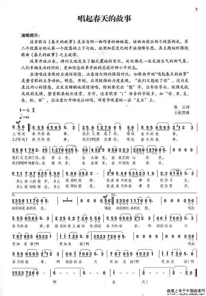 唱起春天的故事,把最美的歌儿献给你。唱起春天的故事,啊,祖国的春天更加美丽。