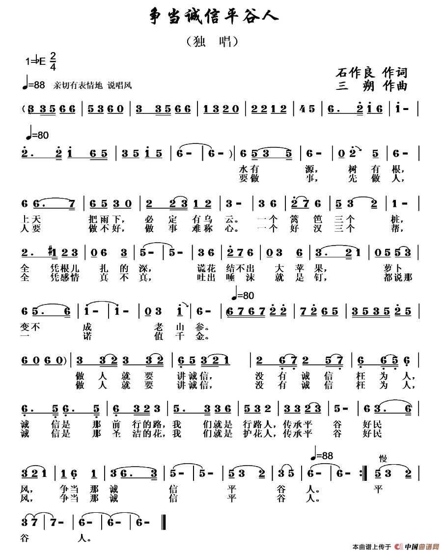 关于《争当诚信平谷人》曲谱的评论