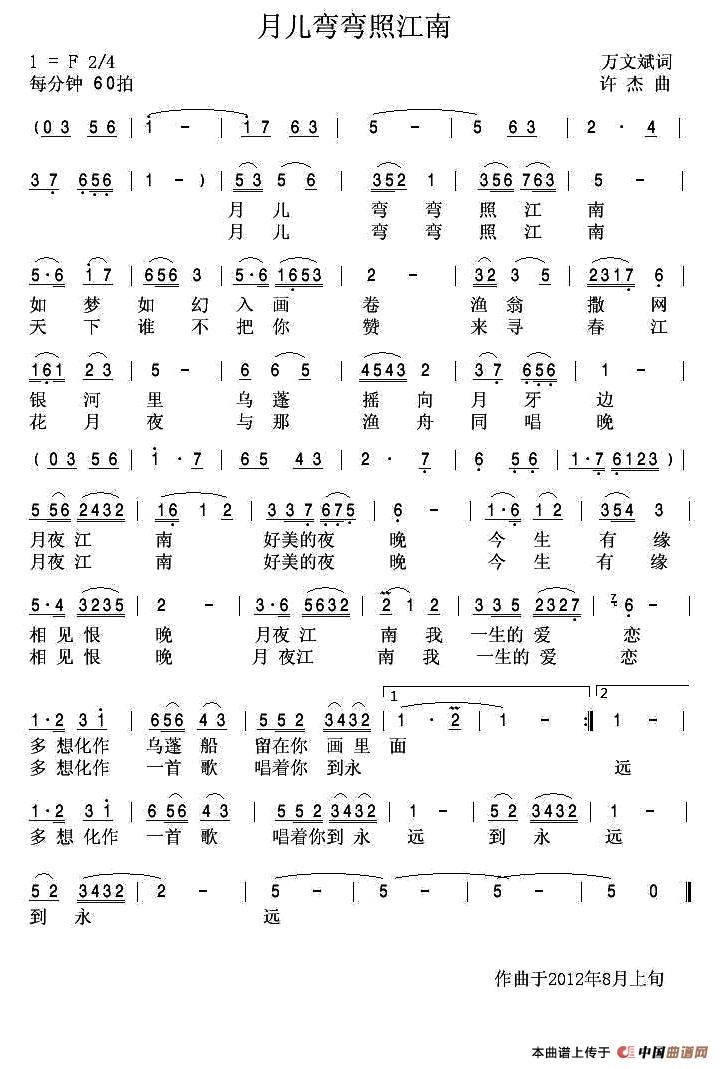 关于《月儿弯弯照江南》曲谱的评论