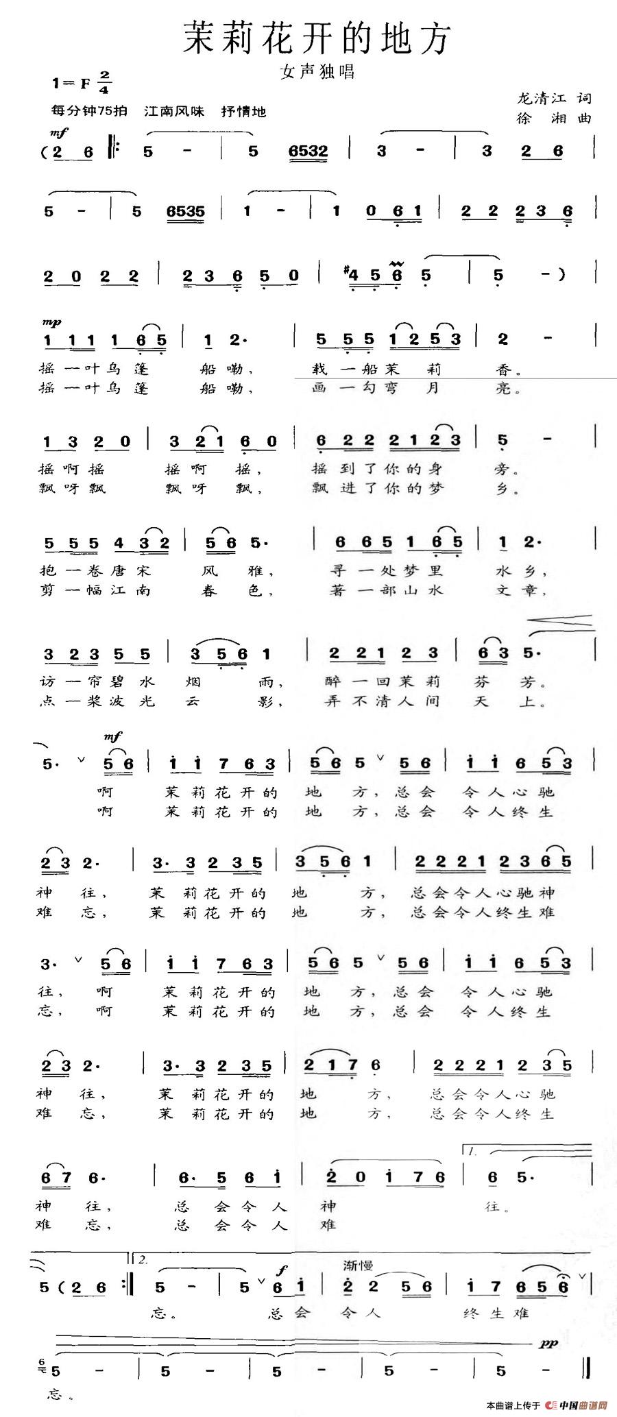 这是本人于2008年初创作的一首苏南风韵的女声独唱歌曲,2008年秋即荣获了中国音协歌曲编辑部年度最佳歌曲评选“晨钟奖”。后经众人演唱和不断修缮,修订版又重新刊登在中央人民广播电台《广播歌选》2010年第一期上。现在的版本已是旧版了,曲谱网上显示已有著名歌唱家张也老师,我没张老师的联系方式,如有可能请贵网站代为转告我的联系方式,并将昨晚上传的定稿版歌谱发给她,期盼由她来演绎飞向全国、全球!曲作者徐湘 [回复]