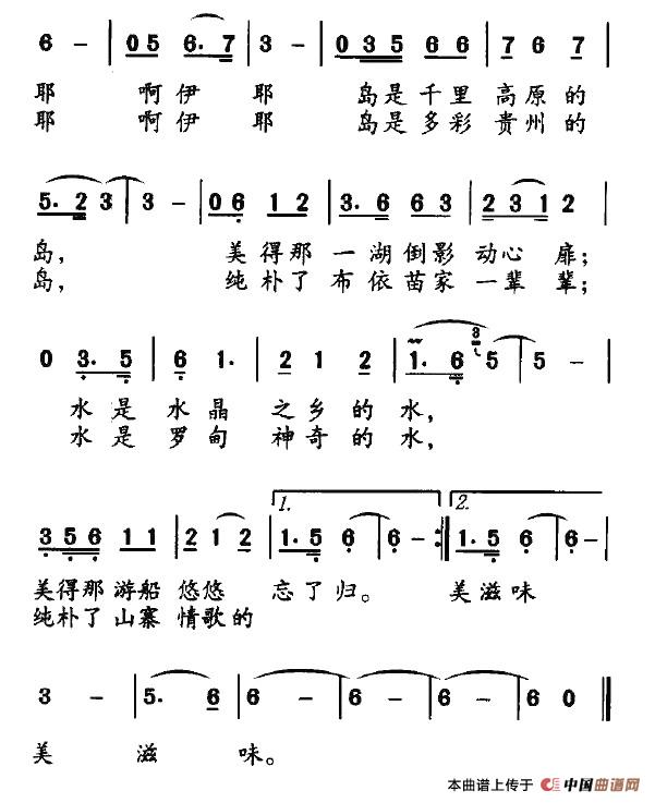 啊伊耶,啊伊耶,岛是千里高原的岛,美得那一湖倒影动心扉,水是水晶之乡的水,