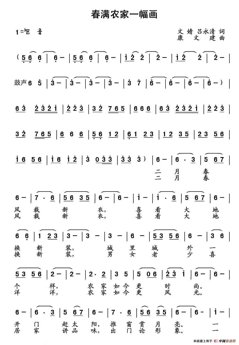 作词:文婧 吕永清 作曲:康文建 编曲:刘根庆 演唱:傅学博 张慧 伴合:刘媛媛 董雯雯、张璇、傅学博、张慧等 二月春风裁新衣 喜看大地换新装 城里城外一个样 农家如今更时尚 开门赶太阳 推窗赏月亮 一排排小楼说气派 新村新貌新风尚 漫步新农村 人人笑脸扬 春满农家一幅画 幸福的时光暖心房 二月春风裁新衣 喜看大地换新装 男女老少喜洋洋 农家如今更风光 居家讲品味 出门论形象 一个个广场亮又明 新人新事新气象 展望新农村 人人把歌唱 春满农家一幅画 美丽的明天漫天香 |