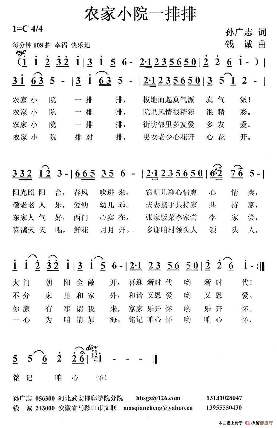 孙广志 词曲编混 殷 玉 录 唱 农家小院一排排, 拔地而起真气派! 阳光照阳台, 春风吹进来, 窗明几净心情爽, 大门朝阳全敞开,喜迎新时代! 农家小院一排排, 院里风情很精彩。 敬老老人乐, 爱幼幼儿乖。 夫妻携手共持家, 不分家里和家外,和谐又恩爱。 农家小院一排排, 街坊邻里多友爱。 东家人气好, 西门心实在。 张家饭菜李家尝, 你家有事请我来,家家乐开怀。 农家小院排对排, 男女老少心花开。 喜鹊天天唱, 鲜花月月开。 多谢咱村领头人, 一心为咱情如海,铭记咱心怀! |