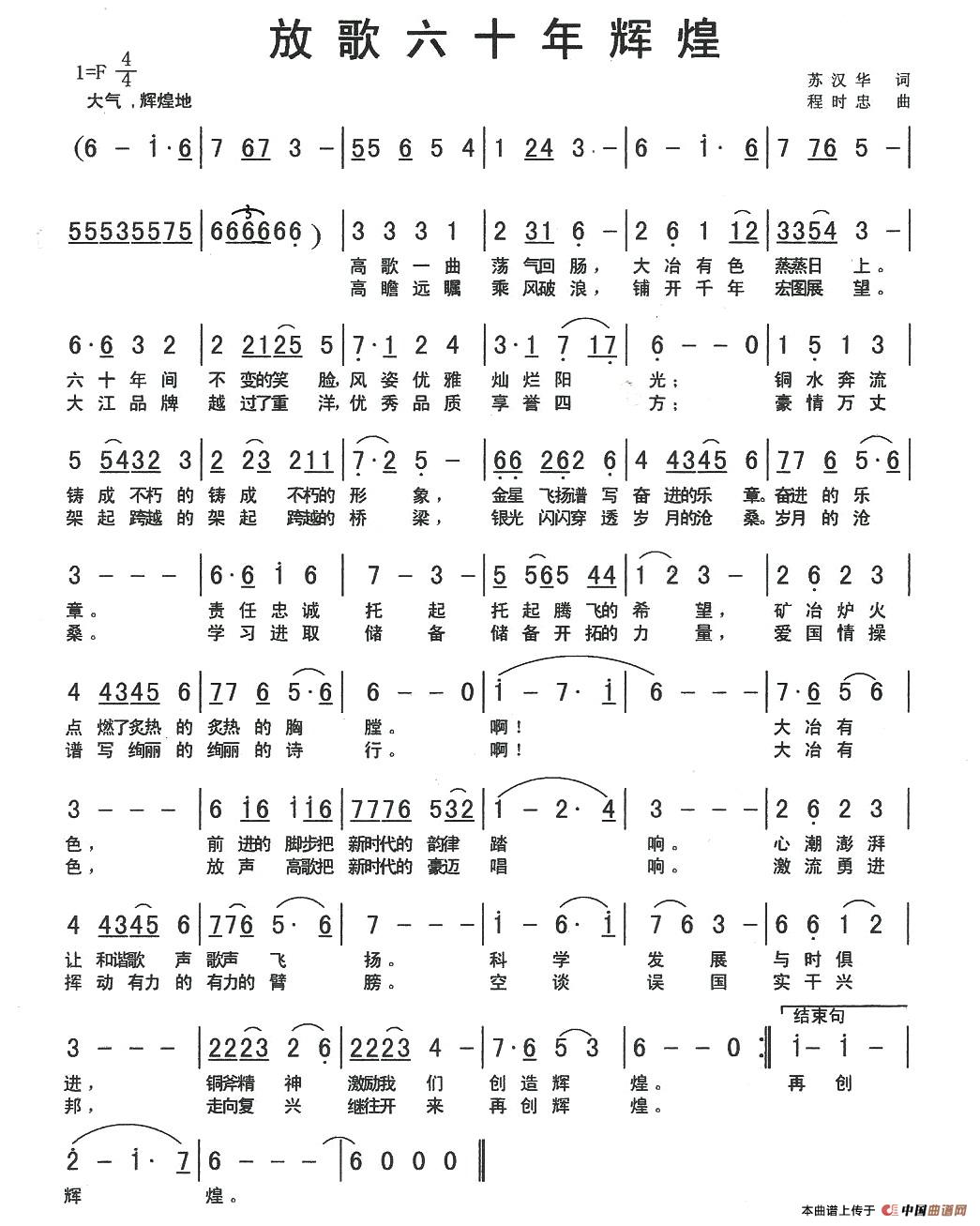 大冶有色蒸蒸日上。 六十年间 不变的笑脸, 风姿优雅 灿烂阳光; 铜水奔流铸成不朽的形象, 金星飞扬谱写奋进的乐章。 责任 忠诚托起腾飞的希望, 矿冶炉火点燃炙热的胸膛。 啊! 前进脚步 把时代的韵律踏响。 心潮澎湃 让和谐歌声飞扬。 科学发展 与时俱进, 铜斧精神 激励我们创造辉煌。 高瞻远瞩 乘风破浪, 铺开千年宏图展望。 大江品牌 越过了重洋, 优秀品质 享誉四方; 豪情万丈架起跨越的桥梁, 银光闪闪穿透岁月的沧桑。 学习 进取储备开拓的力量, 爱国情操谱写绚丽的诗行。 啊! 放声高歌 把时代的豪迈唱响。 激流勇进 挥动有力的臂膀。 空谈误国 实干兴邦, 走向复兴 继往开来再创辉煌。 |