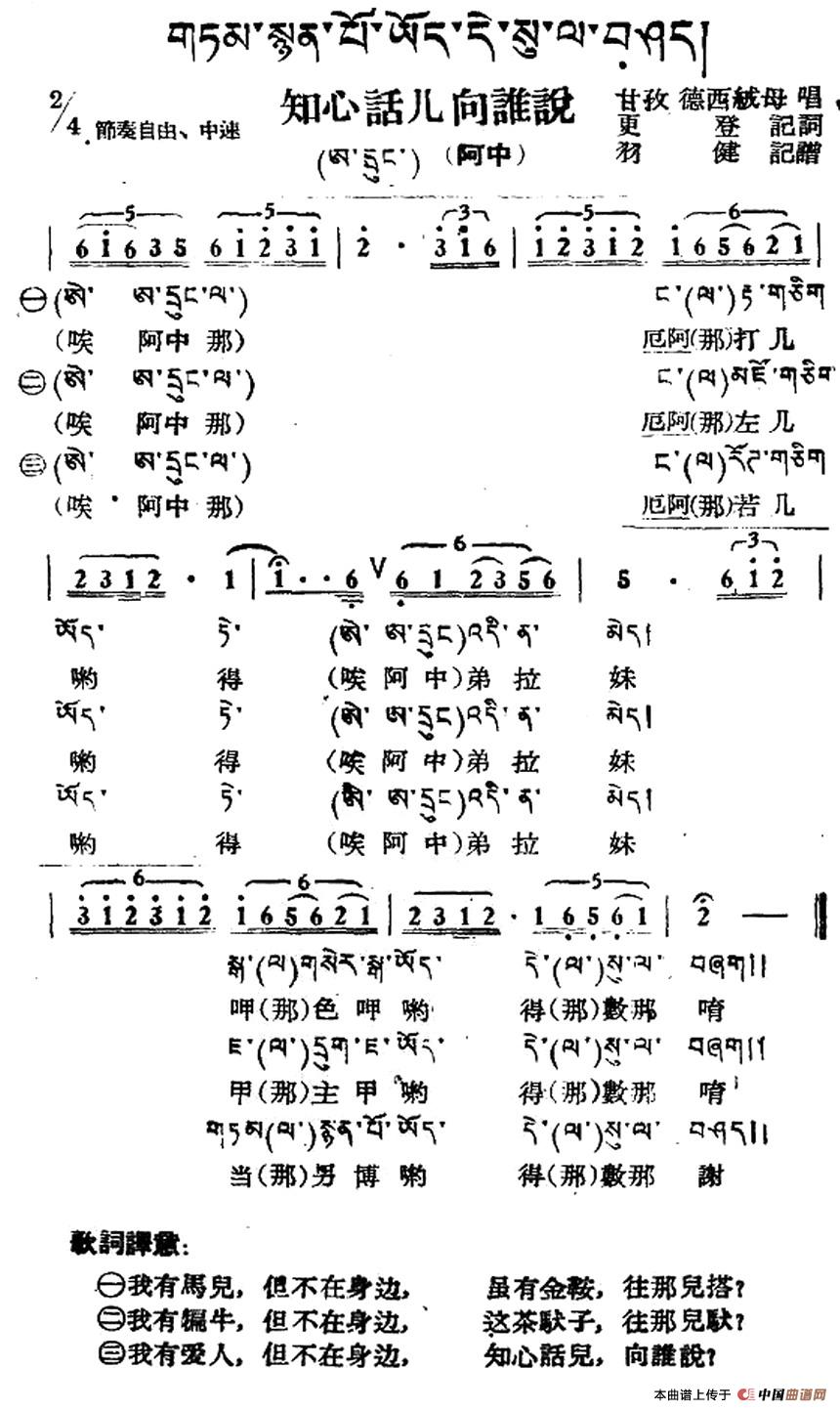 知心话儿向谁说(藏族民歌、藏文及音译版)