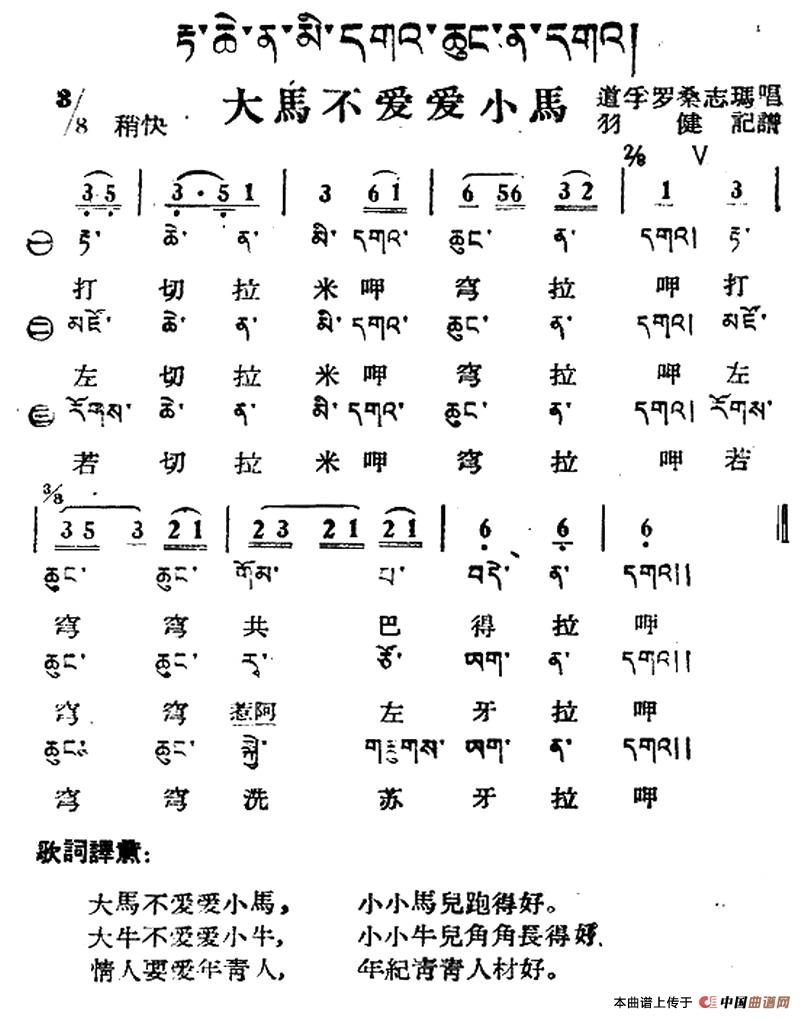 大马不爱爱小马(藏族民歌、藏文及音译版)