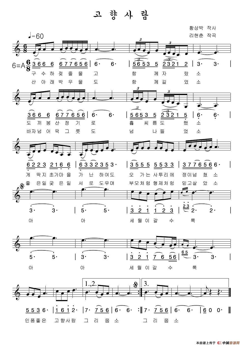 故乡人(朝鲜族文、线简谱混排版)
