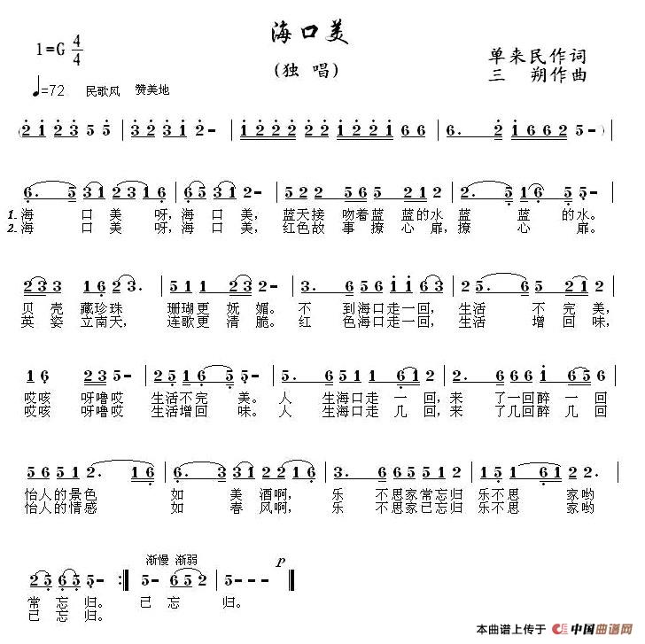 贝壳藏珍珠 珊瑚更妩媚。不到海口走一回, 生活不完美, 哎咳呀噜哎,生活不完美。 人生海口走几回,来了一回醉一回 怡人的景色如美酒啊, 乐不思家常忘归。 海口美呀,海口美,红色故事撩心扉。英姿立南天, 连歌更清脆。红色海口走一回, 生活增回味, 哎咳呀噜哎,生活增回 味。 人生海口走几回,来了几回醉几回 怡人的情感如春风啊, 乐不思家已忘归。 |