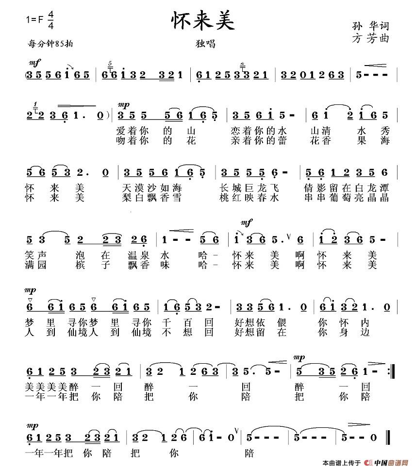 作词:孙华 作曲:方芳 首唱:拉毛王旭 爱着你的山 恋着你的水 山清水秀怀来美 天漠沙如海 长城巨龙飞 倩影留在白龙潭 笑声泡在温泉水 哈- 怀来美 啊怀来美 梦里寻你千百回 好想依偎你怀内 美美美美醉一回 吻着你的花 亲着你的蕾 花香果海怀来美 梨白飘香雪 桃红映春水 串串葡萄亮晶晶 满园槟子飘香味 哈- 怀来美 啊怀来美 人到仙境不想回 好想留在你身边 一年一年把你陪 |