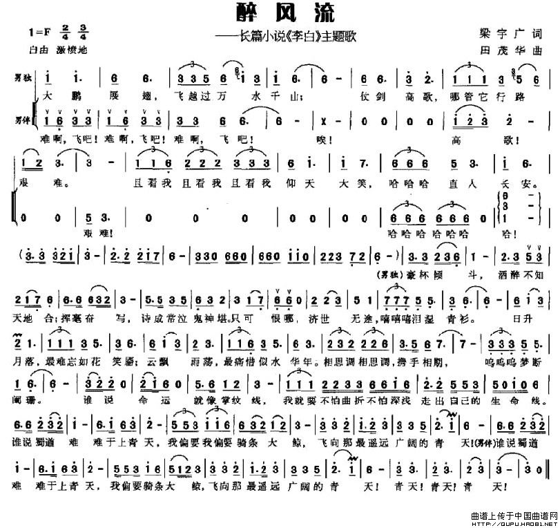 关于《醉风流—长篇小说《李白》主题歌》曲谱的评论