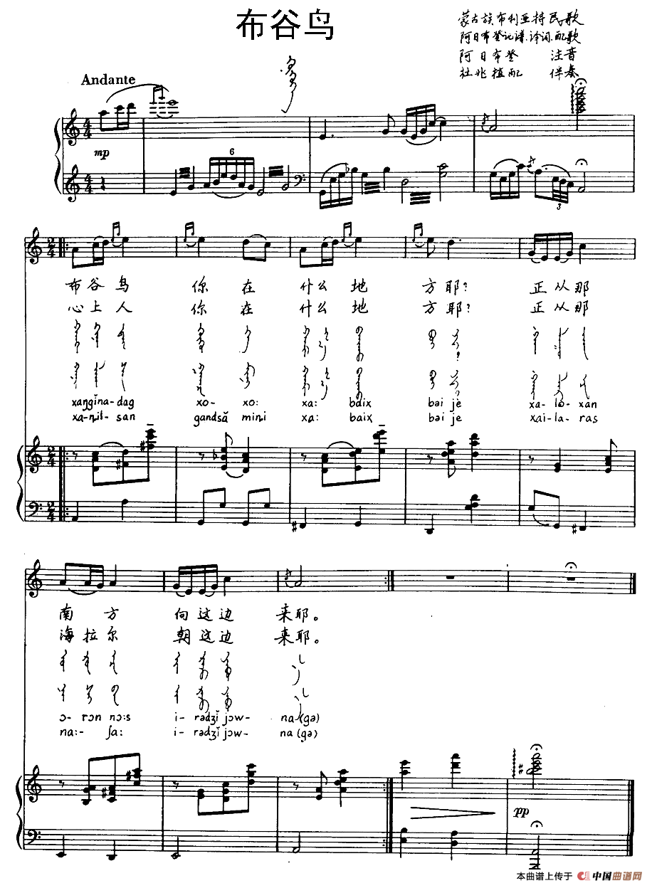 关于《布谷鸟(蒙古族布利亚特民歌)》曲谱的评论