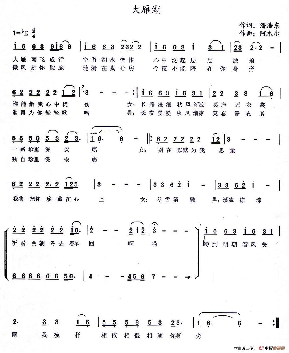 (女)大雁南飞成行,空留湖水惆怅,心中泛起层层波浪,谁能解我心中忧伤?