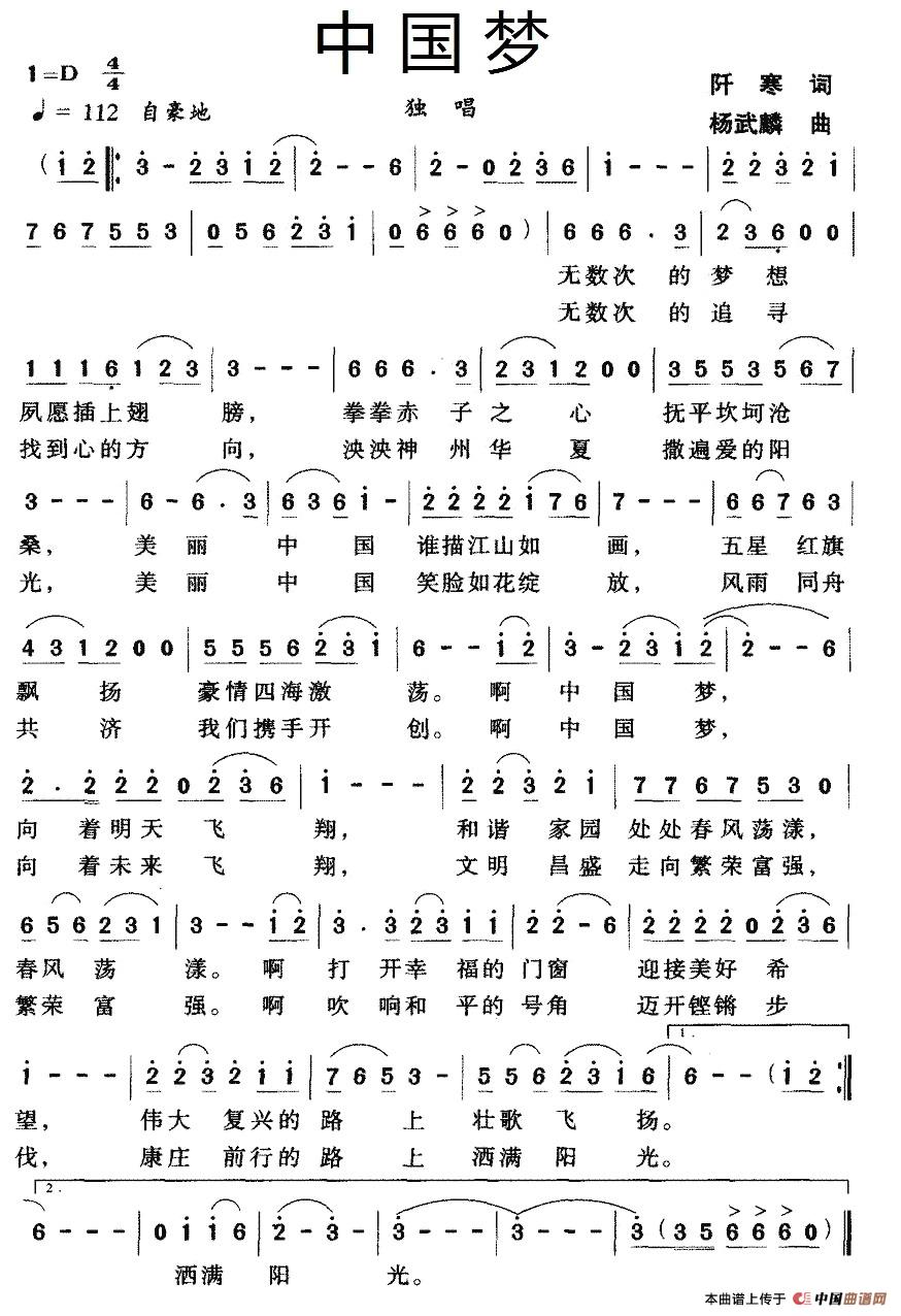 当前位置: 首页 民歌曲谱 三字歌名 中国梦(阡寒词 杨武麟曲)