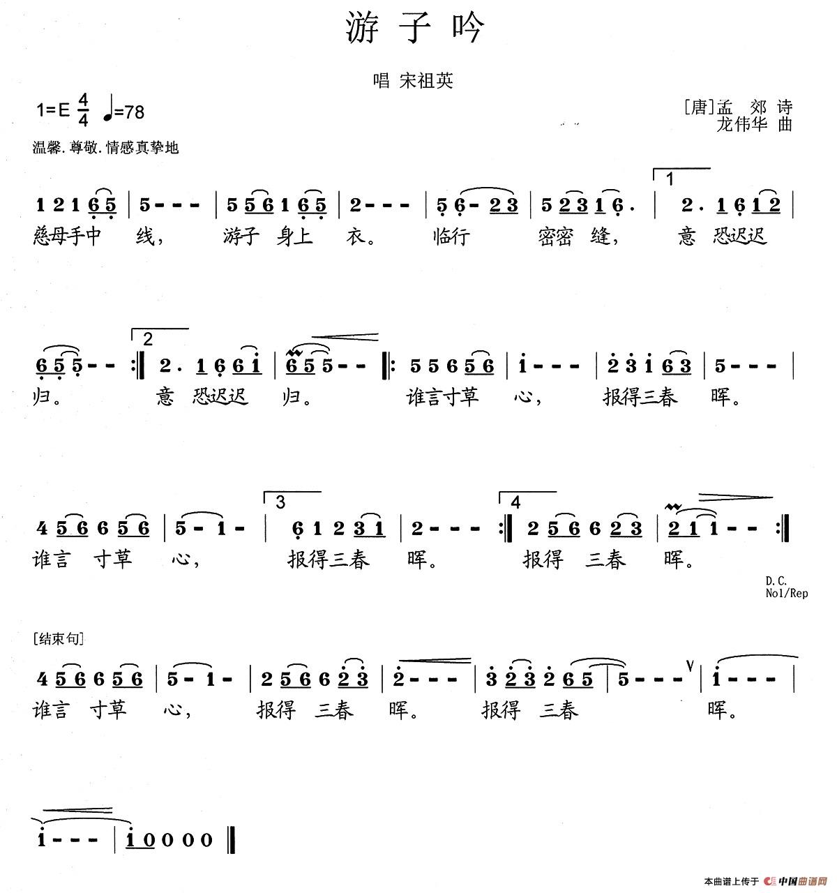 关于《游子吟》曲谱的评论