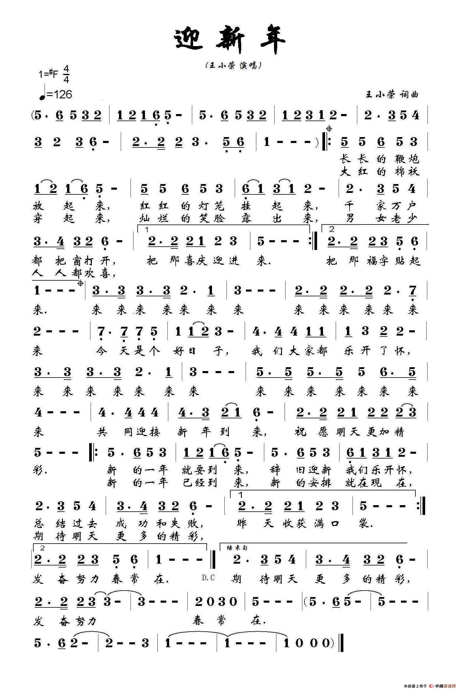 《迎新年》由王小荣作词作曲并演唱、何辉先生制谱,该歌KTV由蓝精灵唱片制作发行、映帆文化/颂今音乐策划推广到全国众多KTV网站和卡拉ok歌厅并可在全国众多音频网站下载试听。