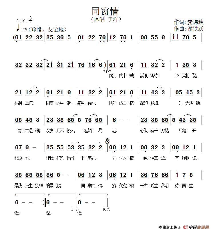 今天特意上传于洋老师的《同窗情》-精彩演唱!上传谱站与大家音乐朋友分享!希望大家喜欢,谢谢!
