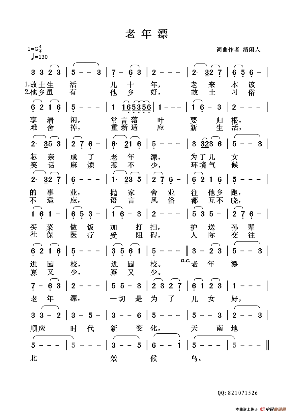 ⒈故土生活几十年,老来本该享清闲,常言落叶要归根,怎奈成了老年漂,为了儿女的事业,抛家舍业往他乡跑,买菜做饭加打扫,护送孙辈进园校,进园校。