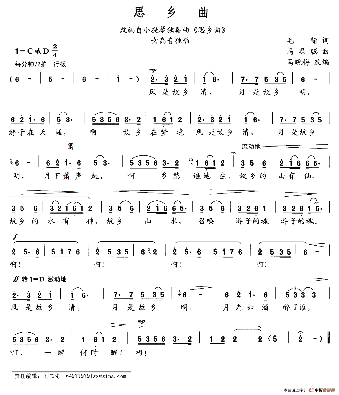 思乡曲(毛翰词 马思聪原曲 马晓梅改编)