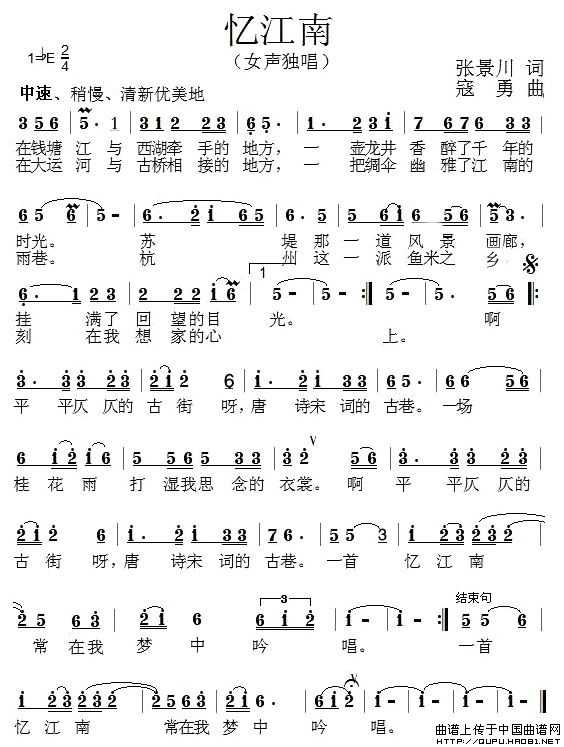 当前位置: 首页 民歌曲谱 三字歌名 忆江南(张景川词 寇勇曲)