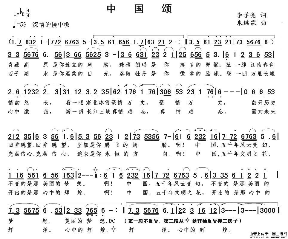 当前位置: 首页 民歌曲谱 三字歌名 中国颂(李学亮词 朱继霖曲)