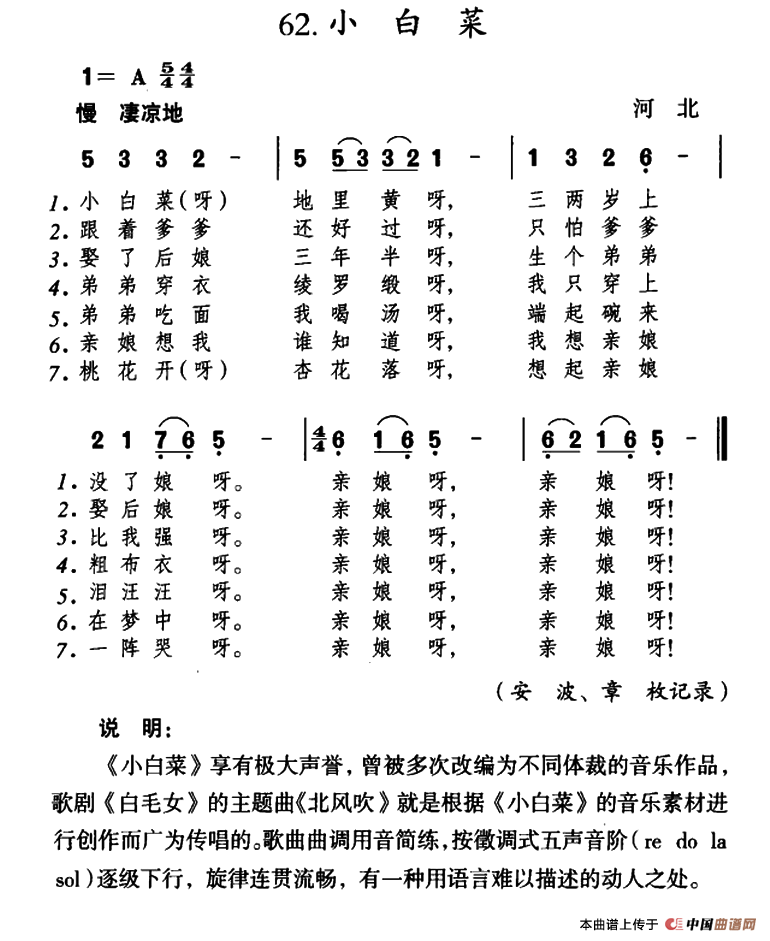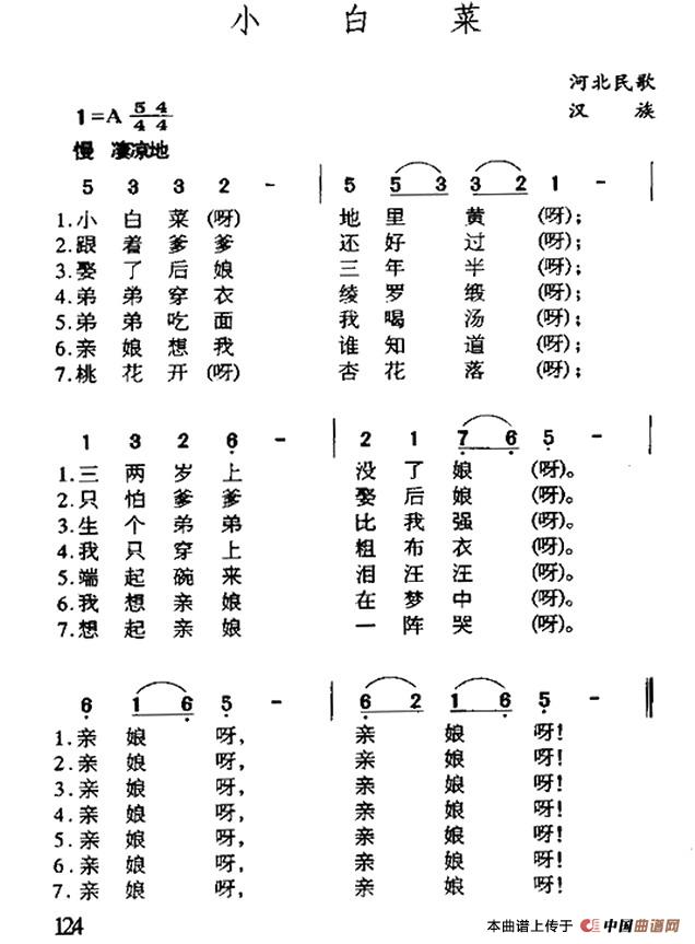 这首《小白菜》,堪称河北乃至整个华北平原民间歌曲的优秀代表。作品的词曲概括性强,易唱易记,几乎传遍了大半个中国。全首歌词采用上、下句式,共七段,扼要地唱出了家庭变故后小主人公受到欺辱的痛苦和凄凉的遭遇。