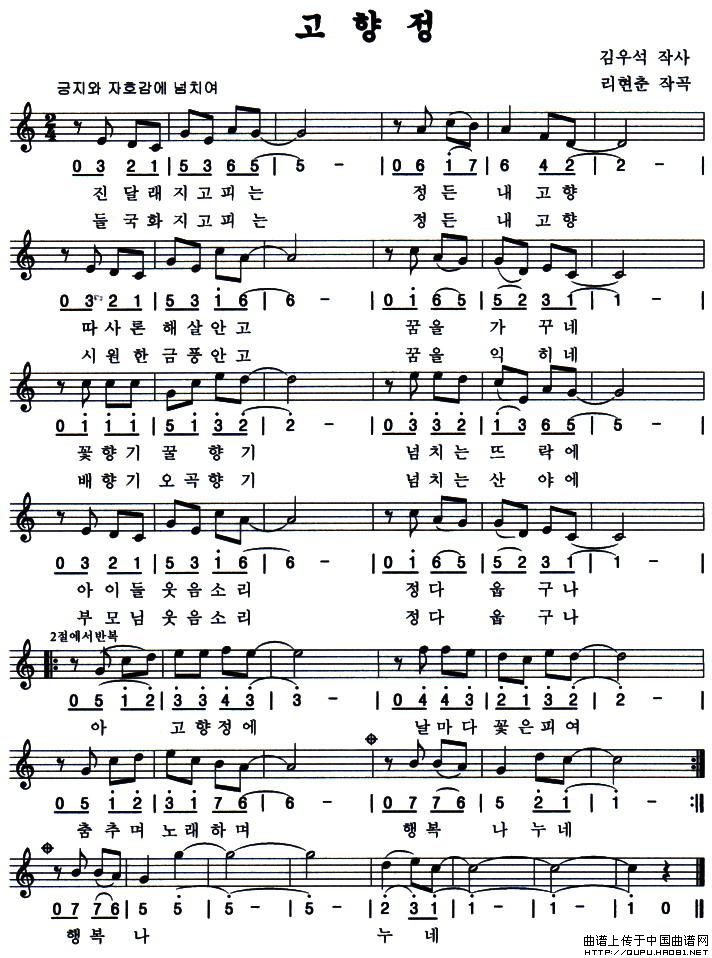 当前位置: 首页 民歌曲谱 三字歌名 故乡情(李炫春词曲、朝鲜族文、线简谱混排版)