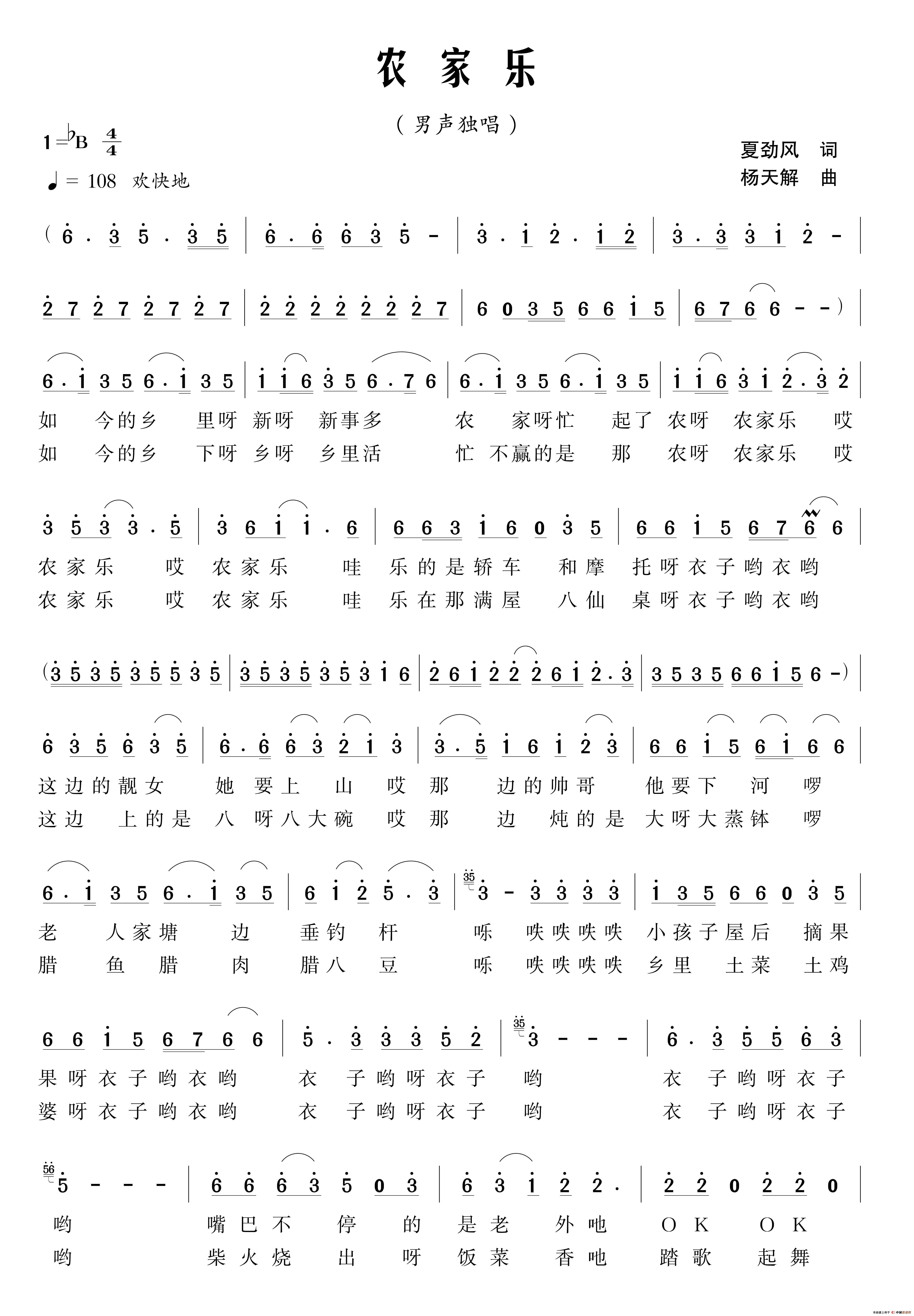 当前位置: 首页 民歌曲谱 三字歌名 农家乐(夏劲风词 杨天解曲)
