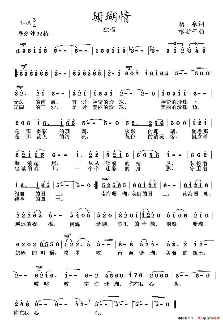 有一片神奇的珍珠, 神奇的珍珠下, 是那多彩的珊瑚, 多彩的珊瑚, 随着那海浪起舞, 一丛丛缤纷的精灵, 装扮着绚丽的国土。 辽阔的三沙, 是一片美丽的珍珠, 美丽的珍珠边, 是那蓝色的清流, 蓝色的清流旁, 挺立着忠诚的战士, 一个个迷彩的身影, 守卫着神圣的国土。 南海珊瑚,美丽的国土, 南海珊瑚,遥远的祝福, 南海珊瑚,梦里的牵挂, 南海珊瑚,妈妈的叮嘱。 哎啰- 南海珊瑚, 美丽的国土, 哎啰- 南海珊瑚, 你在我心头。。。 |