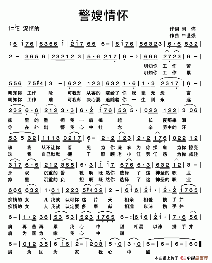 作词 刘伟 作曲 牛世强 演唱 石彩霞(关中女儿)首唱 明知你工作苦 明知你工作险 可我却从容的嫁给了你我毫无怨言 家里的重担我一肩挑起 长夜那串泪珠我从不让你看见 为你洗衣为你揉肩 为你擦亮那双沉重的警靴 既然你选择了这神圣的职业 痴情的女儿我就认可你这片天 相亲相爱携手并肩 再苦再累我心中甜 明知你工作累 明知你工作难 可我却决心要追随着你一生到永远 你在外出警我心中挂念 辛劳中的汗珠我自己默默擦干 照顾老小任劳任怨 为你减轻家里沉重的负担 既然你选择了这神圣的职业 痴情的女儿我就认定要多奉献 相濡以沫携手并肩 为国为家我心中甜 |