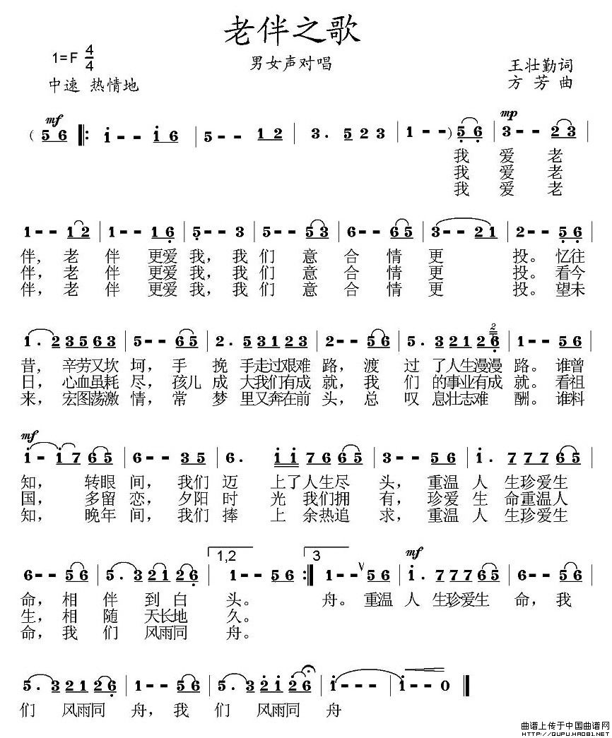 於是就产生了《老伴之歌》。北京电视台02年3月10日的《首都公民道德晚会》一对夫妻歌唱家潘菲王英民演唱了这首歌。