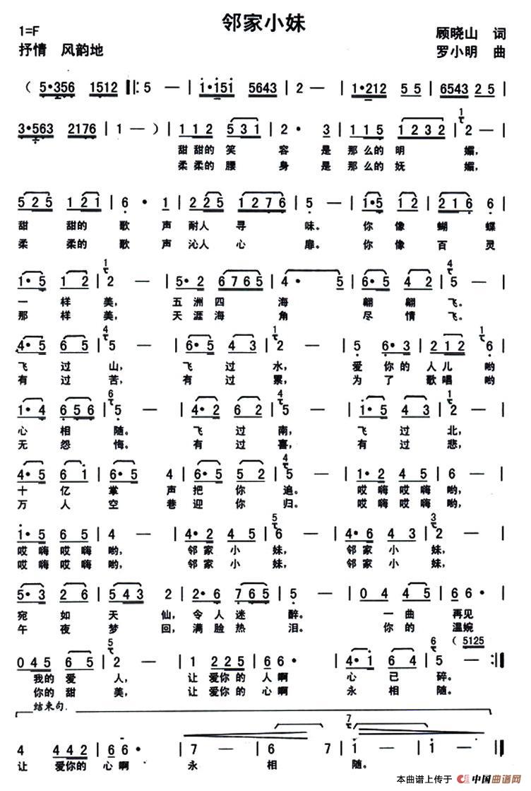 甜甜笑容那么明媚, 甜甜歌声耐人寻味。 你象蝴蝶一样美, 五洲四海翩翩飞。 飞过山、飞过水, 爱你的人儿心相随。 飞过南、飞过北, 十亿掌声把你追。 邻家小妹,邻家小妹, 宛如天仙,令人迷醉。 一曲再见我的爱人, 让爱你的人啊心已碎。 柔柔腰身那么妩媚, 柔柔歌声沁人心扉。 你象百灵那样美, 天涯海角尽情飞。 有过苦、有过累, 为了歌唱哟无怨悔。 有过喜、有过悲, 万人空巷迎你归。 邻家小妹,邻家小妹, 午夜梦回,满脸热泪。 你的温婉你的甜美, 让爱你的心啊永相随。 |
