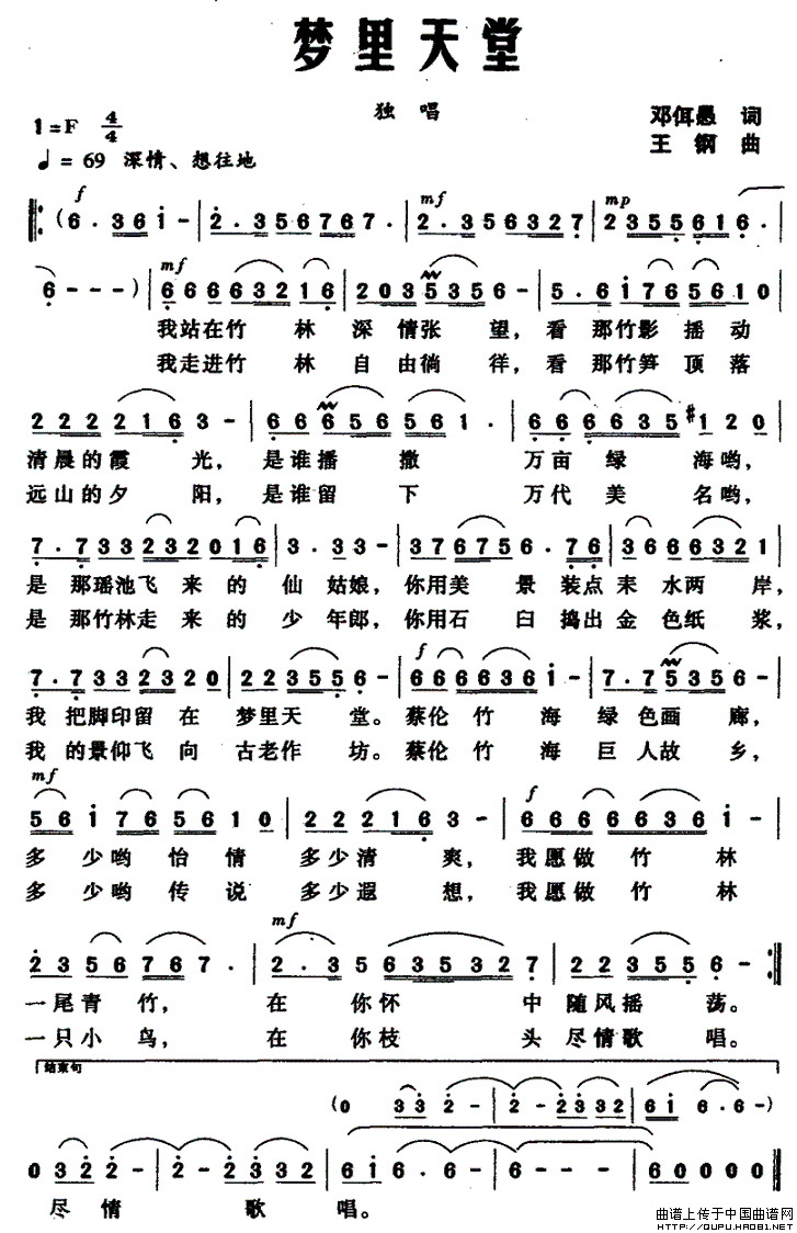 当前位置: 首页 民歌曲谱 四字歌名 梦里天堂(邓佴愚词 王钢曲)