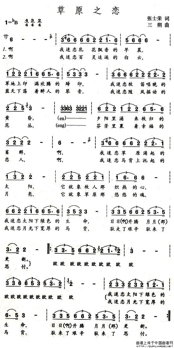 《草原之恋》,张士荣作词三朔作曲,发表于1996年第6期《歌曲》杂志上。