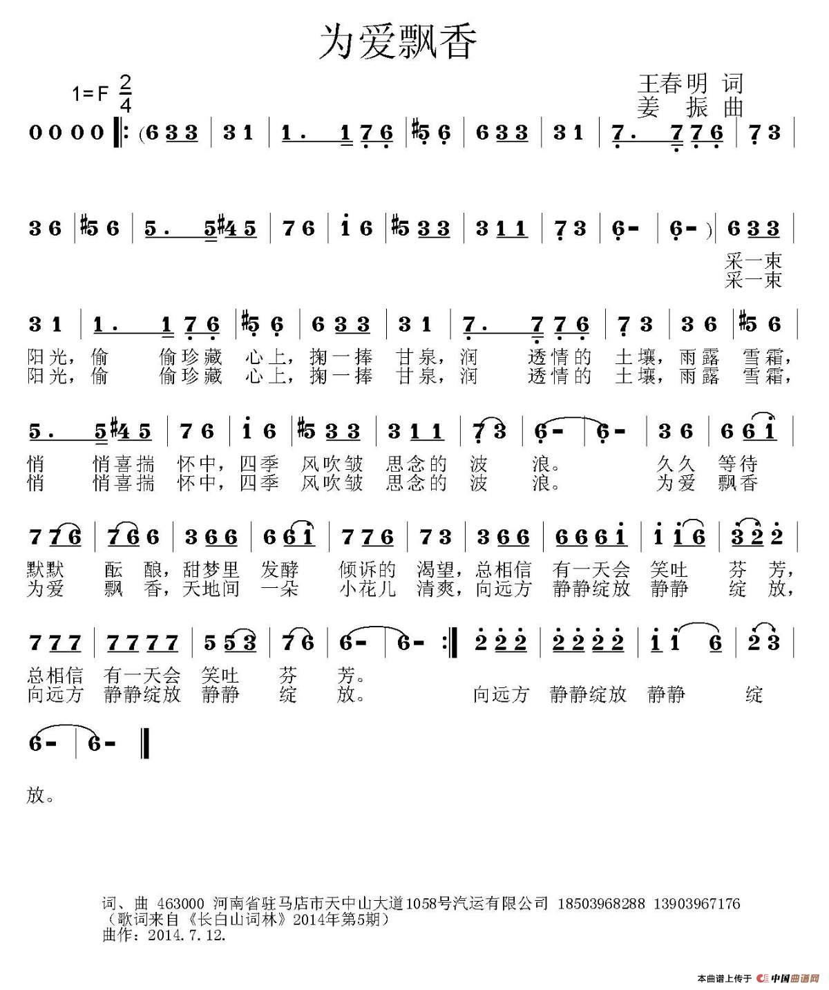 作词:王春明   作曲:姜振   来源:原创作品   上传:姜振   日期:2014-12-01   浏览次数: