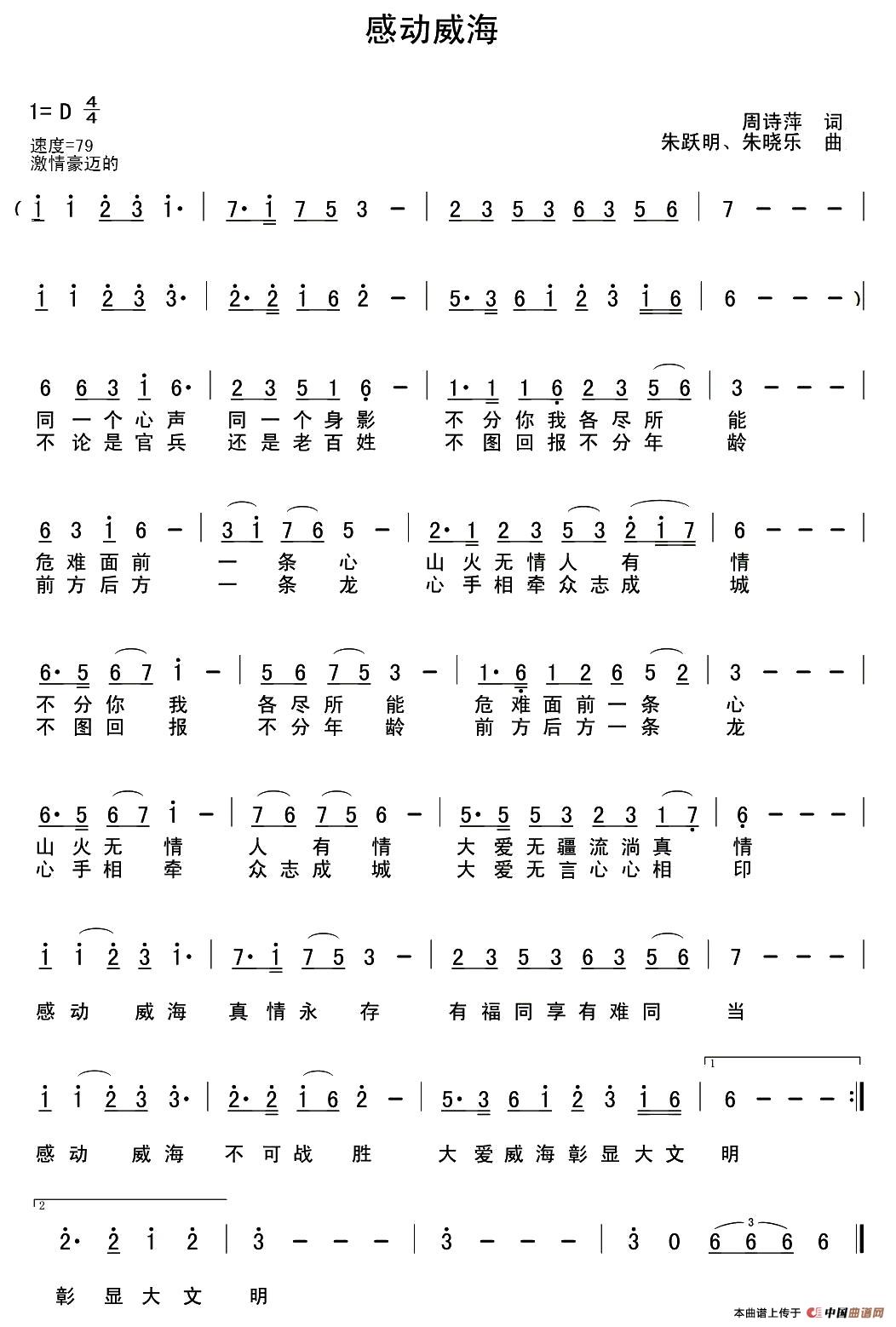 2014年5月29日威海市区山林突发大火,危急关头,在市领导的正确指挥下,广大官兵和老百姓有秩序地灭火抢险,没有出现一人伤亡事件。涌现出一幕幕可歌可泣的感动画面,展示出我们威海人的高度文明和团结一心心手相牵,亲如一家人的温暖场面。我的儿子也与广大机关干部一道在火场连续奋战了几天几夜。大火终于在6月1日上午11点5分完全扑灭。胜利完成了任务。发自内心的感动写了这首歌词,来赞美我们可敬可爱的威海人!歌词发出去之后很快得到朱跃明老师和他的儿子朱晓乐教授的热情曲编唱,制作歌曲是一个很费时间和精力的过程,朱老师能在这么短的时间内把歌曲完成,这份满怀对威海家园的爱心很让我们感动万分,在此对朱老师一家的无私奉献精神表示衷心感谢!致敬!。虽然火已经灭掉。但威海人心里的这份感动依然久久地留在人们的心中,请让我们用歌声把这份正能量继续传递下去吧!!!