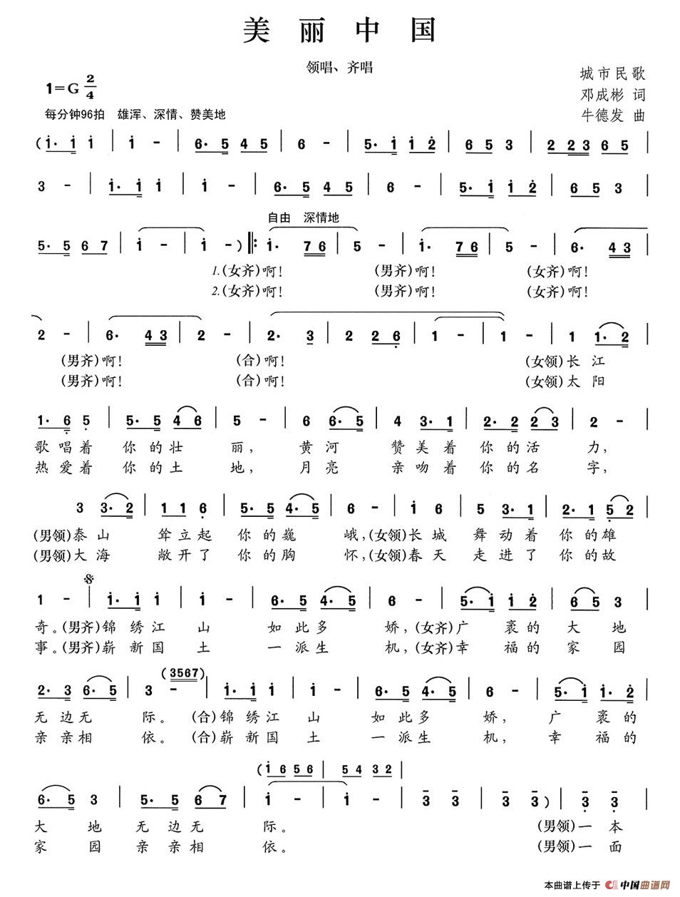 当前位置: 首页 民歌曲谱 四字歌名 美丽中国(邓成彬词 牛德发曲)