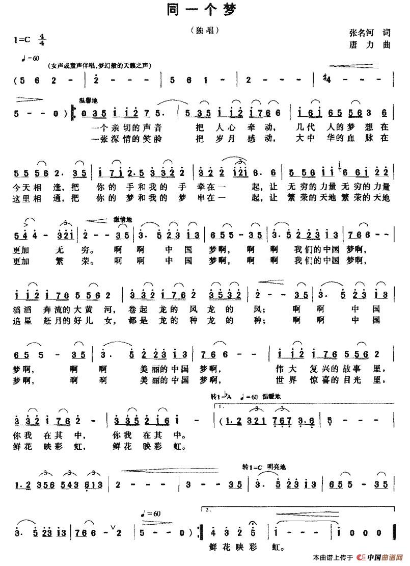 当前位置: 首页 民歌曲谱 四字歌名 同一个梦(张名河词 唐力曲)