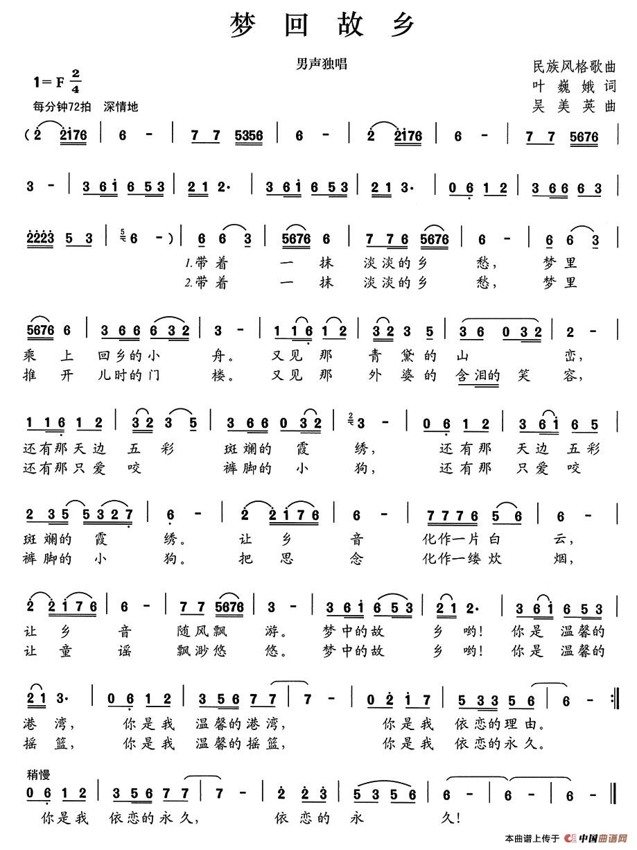 关于《梦回故乡》曲谱的评论