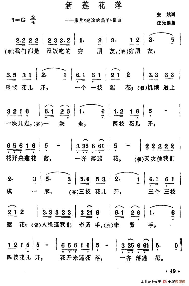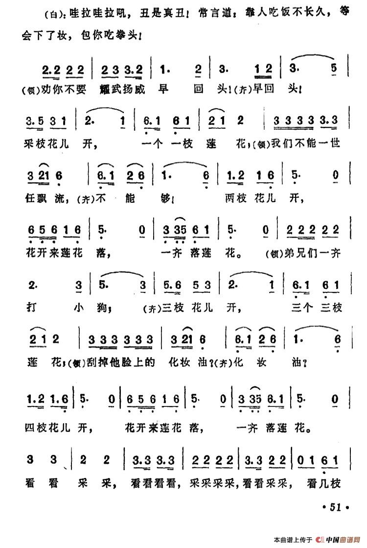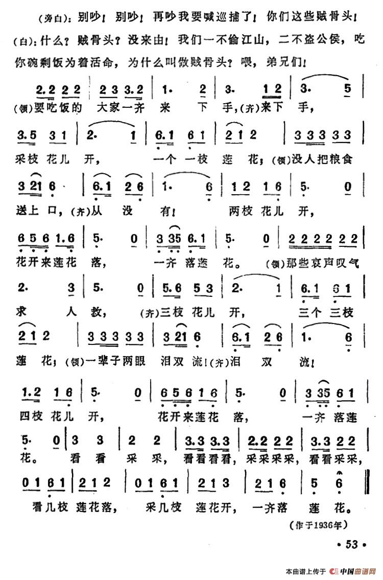 没人把粮食送上口,从没有。两枝花儿开,花开来莲花落,一齐落莲花。