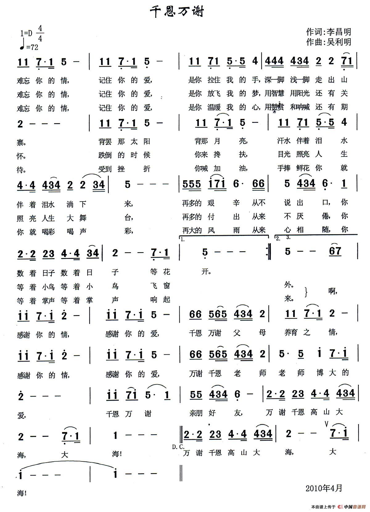致谢:《中国曲谱网》衷心感谢作者老师馈赠原版歌谱!