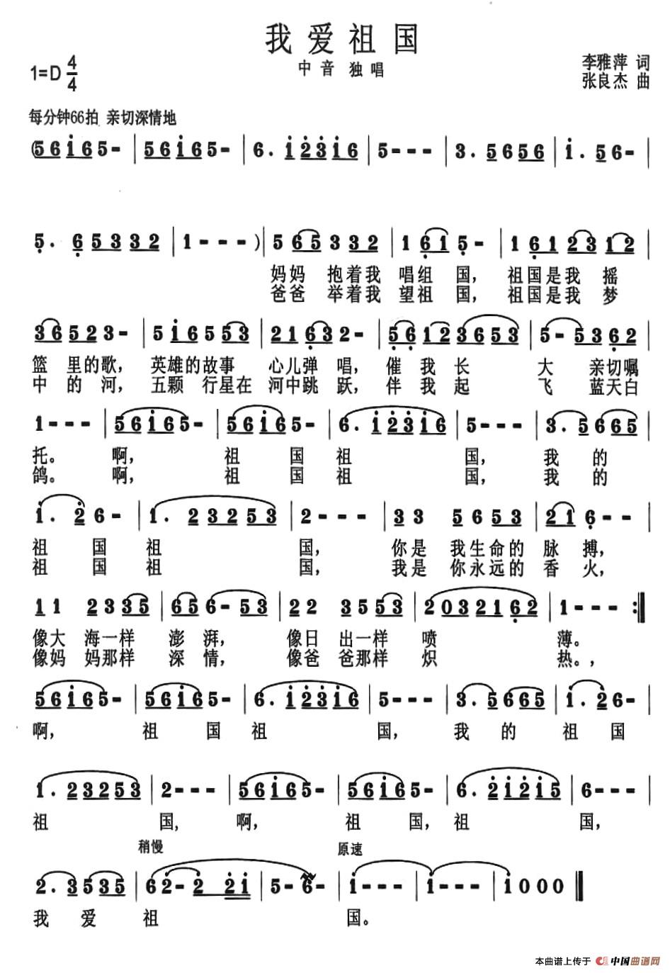 当前位置: 首页 民歌曲谱 四字歌名 我爱祖国(李雅萍词 张良杰曲)