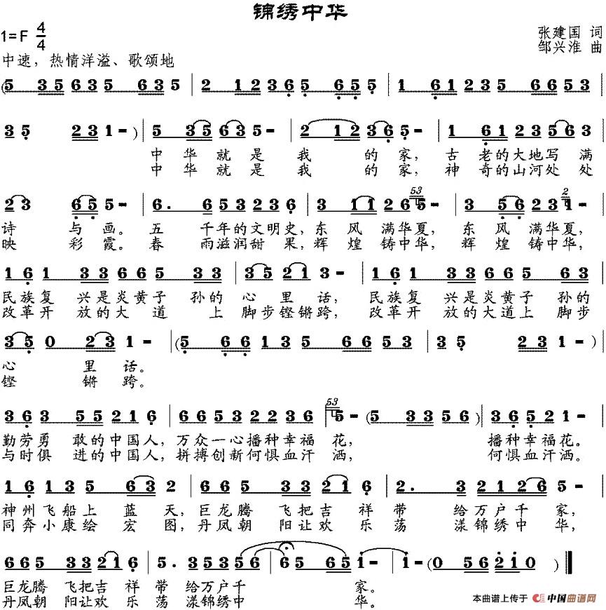 当前位置: 首页 民歌曲谱 四字歌名 锦绣中华(张建国词 邹兴淮曲)