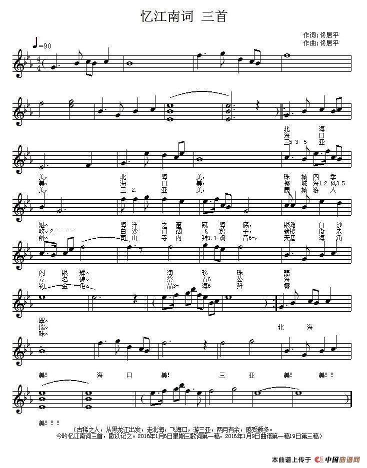 后记:古稀之人,从黑龙江出发,走北海,飞海口,游三亚,两月有余,感受颇多。今吟忆江南词三首,歌以记之。这三座城市旅游景点很多:北海市的“海洋之窗”可以窥视海底一斑,“银滩”白沙细又白,银光闪闪。北海“老街”,珍珠翡翠琳琅满目,是淘宝人的乐园。海口市“白沙门公园”很大,绿地上多人在放飞风筝,南方人称之为鹞子:yào zǐ。“骑楼老街”,中国文化部、国家文物局于2009年6月10日立有“中国历史文化名街”碑一座。服装批发市场一排排,货物成堆,人山人海。去祭奠“五公祠”和“海瑞墓”,可以史为鉴。三亚市“南山文化旅游区”拜“南海观音”,求国富民强、幸福安康。“天涯海角”一游,寻觅“ 天涯情结”,感受大海宽阔的胸怀。还可尽享海鲜、椰汁、芭蕉美味。2016年1月6日星期三,居平手记。