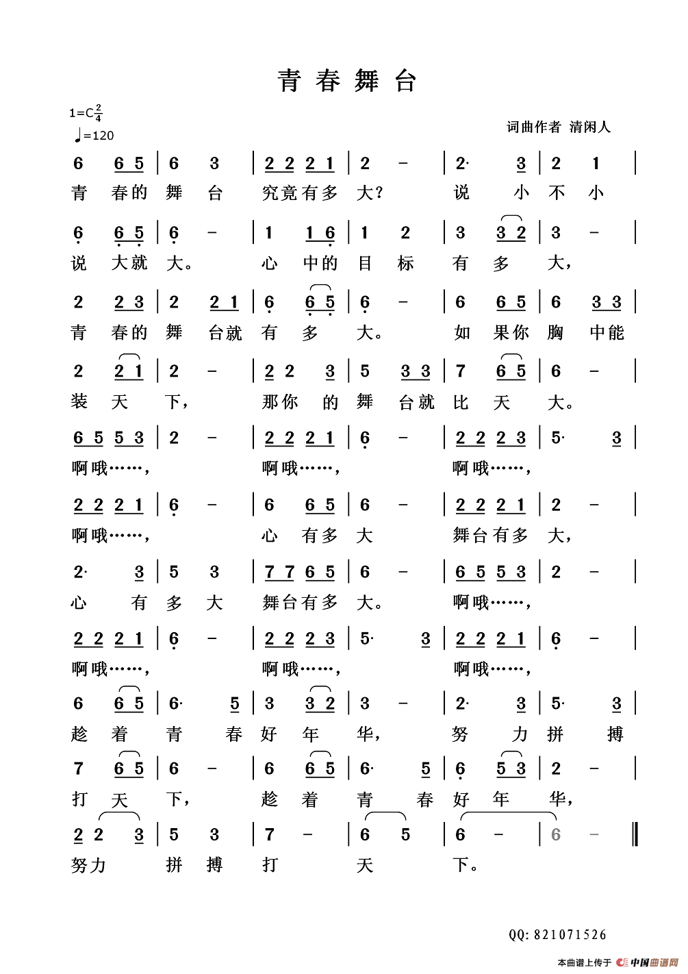 青春的舞台究竟有多大?说小不小说大就大。心中的目标有多大,青春的舞台就有多大。如果你胸中能装天下,那你的舞台就比天大。啊哦……,啊哦……,啊哦……,啊哦……,心有多大舞台有多大,心有多大舞台有多大。啊哦……,啊哦……,啊哦……,啊哦……,趁着青春好年华,努力拼搏打天下,趁着青春好年华,努力拼搏打天下。