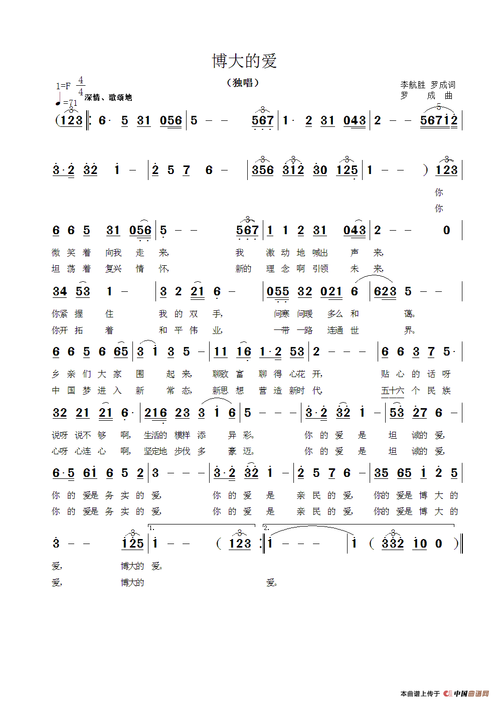 歌曲《博大的爱》以抒情男高音和混声伴唱的演唱形式,深情地歌颂在以***同志为总书记的党中央,以实现中华民族的伟大振兴为己任,始终代表中国最广大人民的根本利益。带着对人民群众的深切牵挂和深情厚谊一如既往地深入基层、关心群众、关注民生的一举一动 察民情、访民意问寒问暖、解决民生存在的许多问题。以新思想引领新常态以新理念指导新实践以新战略谋求新发展,令全国人民深受感动。习总书记的爱是博大精深的爱,纯洁务实的爱指引着中华民族实现伟大复兴的中国梦。歌曲宽宏嘹亮、起伏跌宕、意味深长,会带给听众不同的感受和遐想。