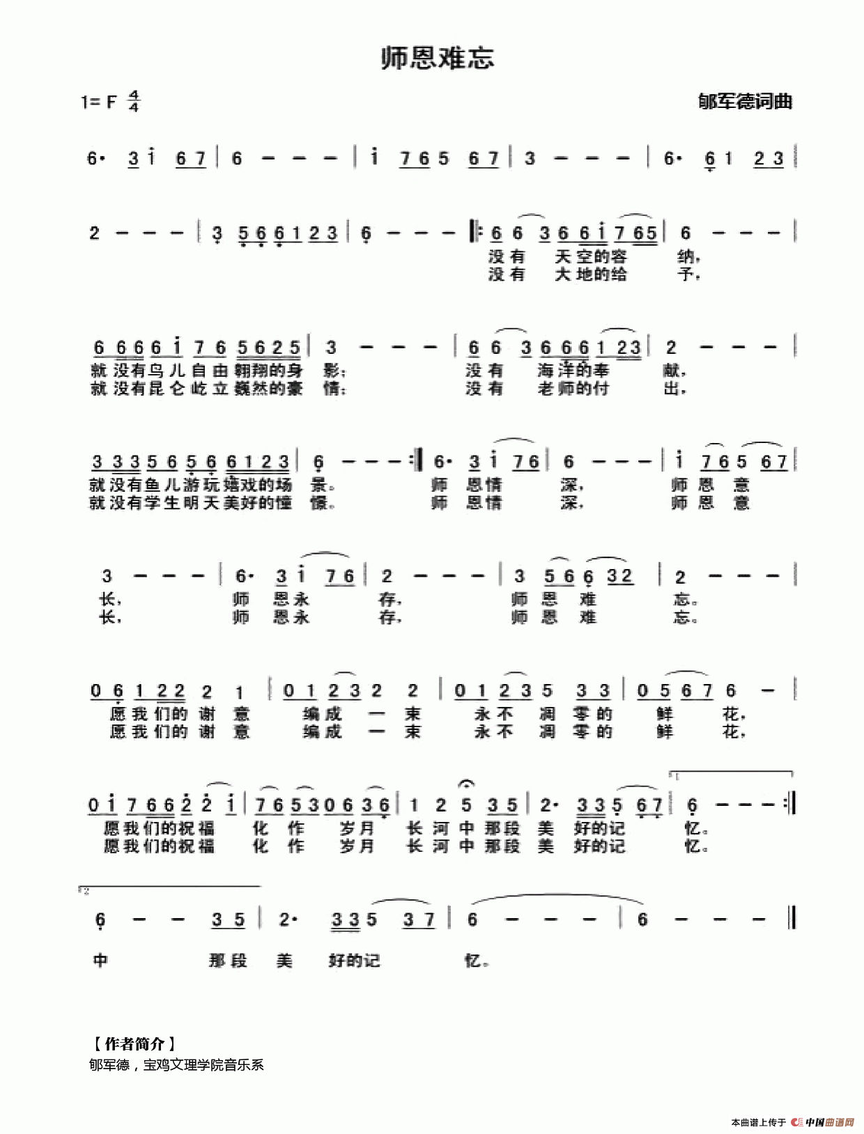 当前位置: 首页 民歌曲谱 四字歌名 师恩难忘(郇军德词 郇军德曲)