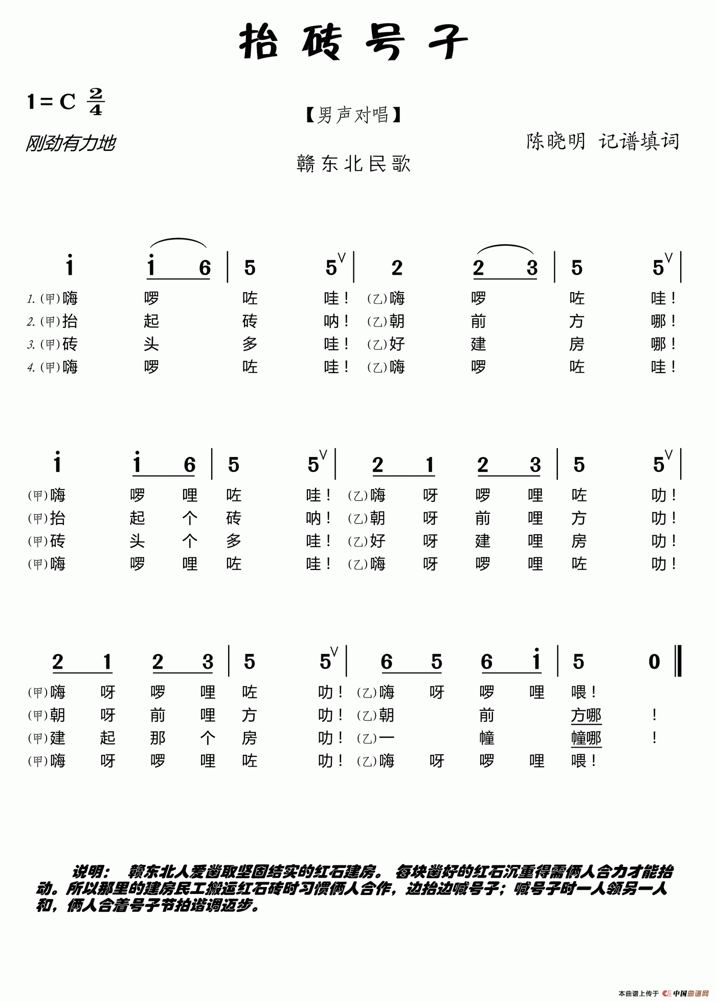 作词:陈晓明 填词 作曲:赣东北民歌 来源:根据赣东北建房民工抬砖时所唱号子记谱整理 上传:白者