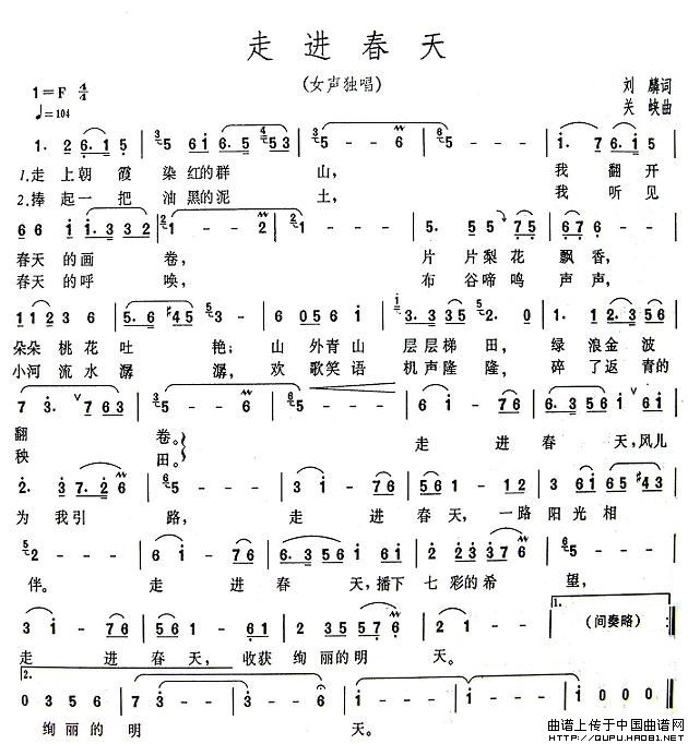 孙丽英演唱的《走进春天》,以音色甜美的声音及轻盈飘逸相交融的形式,充满诗情地展现了祖国大地今朝的春光明媚。曲谱轮弹上传了伴奏及全套资料:http://bbs.qupu123.com/thread-8625-1-1.html