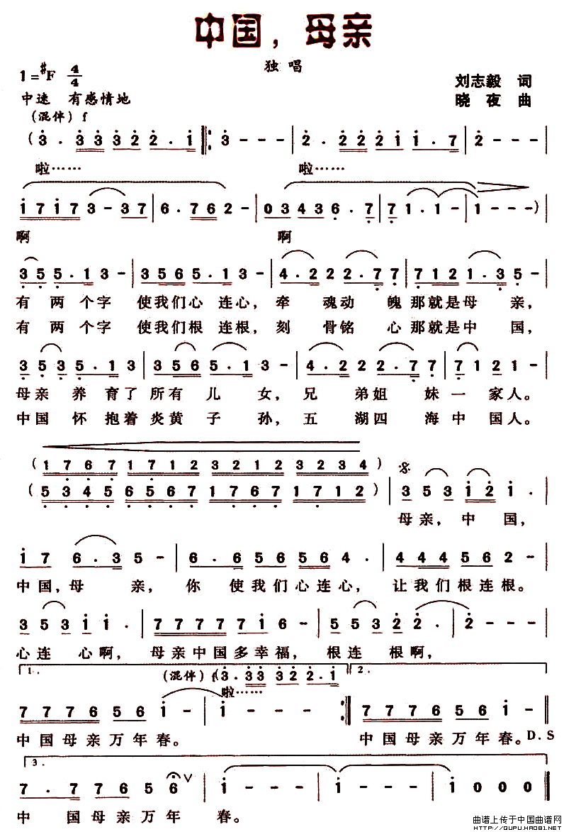 当前位置: 首页 民歌曲谱 四字歌名 中国,母亲